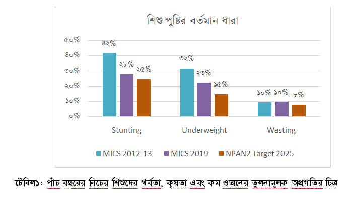 বাংলাদেশ সাম্প্রতিককালে পুষ্টির বিভিন্ন সূচকে উল্লেখযোগ্য অগ্রগতি অর্জন করেছে। বিশেষ করে স্থায়ীত্বশীল উন্নয়ন লক্ষ্যমাত্রা ২০৩০ এর পুষ্টির অভীষ্ঠ সূচক অর্জনে বাংলাদেশ মোটামুটি সঠিক পথেই আছে। পুষ্টির তিনটি গুরুত্বপূর্ণ সূচক খর্বতা (ষ্টান্টিং), কৃশকায় (ওয়াষ্টিং)এবং স্বল্পওজনের (কম ওজন) শিশু এই তিনটি ক্ষেত্রে সূচকের প্রত্যাশিত লক্ষ্যের দিকে ধারাবাহিকভাবে সঠিক পথে আছে। (টেবিল ১) তবে মায়েদের মধ্যে রক্তস্বল্পতা কমানোরক্ষেত্রে আমাদের চলমান তৎপরতা আরো জোরদার করতে হবে। বাংলাদেশ সরকার সাম্প্রতিককালে শস্যভিত্তিক খাদ্যে স্বয়ংসম্পূর্ণতা অর্জনের পর পুষ্টি উন্নয়নের দিকে নজর দেয়।