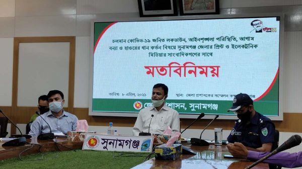 বিশেষ প্রতিনিধি:: সুনামগঞ্জের করোনা পরিস্থিতি, আইন শৃঙ্খলা পরিস্থিতি, আগাম বন্যা ও হাওরের বোরো ধান কর্তনসহ বিভিন্ন বিষয়ে স্থানীয় গণমাধ্যম কর্মীদের সঙ্গে মতবিনিময় করেছে জেলা প্রশাসন। করোনা পরিস্থিতিতে জনগণকে সচেতন করা,