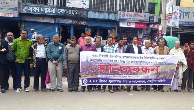 বিশেষ প্রতিনিধি:: সুনামগঞ্জের শাল্লা উপজেলায় হাওরের ফসলরক্ষা বাঁধ নির্মাণে গঠিত পিআইসিতে অনিয়ম, অপ্রয়োজনীয় বাঁধ নির্মাণ বন্ধ ও বিভিন্ন বাঁধে প্রয়োজনের অতিরিক্ত বরাদ্দ বাতিলের দাবিতে মানববন্ধন করেছে হাওর বাচাও সুনামগঞ্জ বাঁচাও