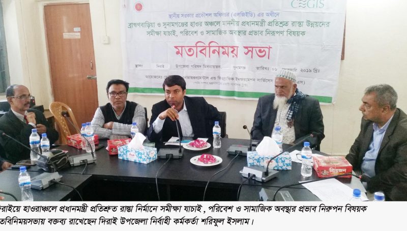 দিরাই প্রতিনিধি:: সুনামগঞ্জের দিরাইয়ে প্রধানমন্ত্রী শেখ হাসিনা প্রতিশ্রুত দুটি রাস্তা উন্নয়নে সমীক্ষা যাচাই, পরিবেশ ও সামাজিক অবস্থার প্রভাব নিরুপন বিষয়ক মতবিনিময় সভা অনুষ্ঠিত হয়েছে। সেন্টার ফর এনভায়রনমেন্টাল এন্ড জিওগ্রাফিক ইনফরমেশন