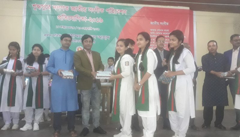 বিশেষ প্রতিনিধি:: সুনামগঞ্জে শুদ্ধসুরে দলগত জাতীয় সঙ্গীত প্রতিযোগিতা সম্পন্ন হয়েছে। শনিবার দিনব্যাপী শহিদ আবুল হোসেন মিলনায়তনে জেলার ১১ উপজেলার প্রাথমিক, মাধ্যমিক ও উচ্চ মাধ্যমিক পর্যায়ের শিক্ষার্থীরা দলগতভাবে নির্বাচিত প্রতিষ্ঠানের হয়ে